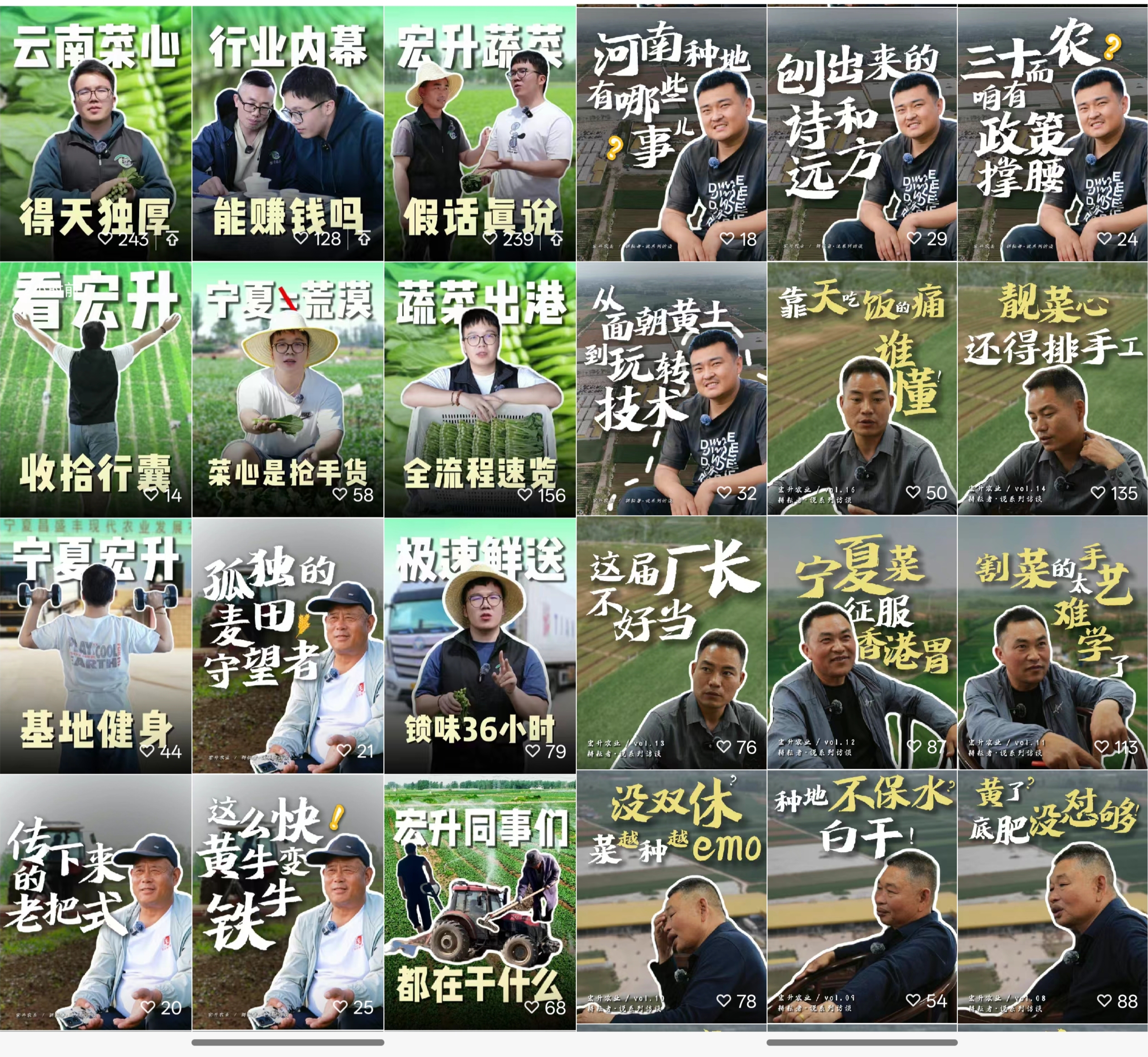一年更新80条视频,拍凌晨三点到货的冷链车,拍云南基地的水肥一体机,拍菜农升职记……点赞最高的一条叫《想当将军的老农》,讲述一位1983年就下田的老农,如何从洒水小工成长为管理2000亩地的“技术大总管”,播放量超过20万。