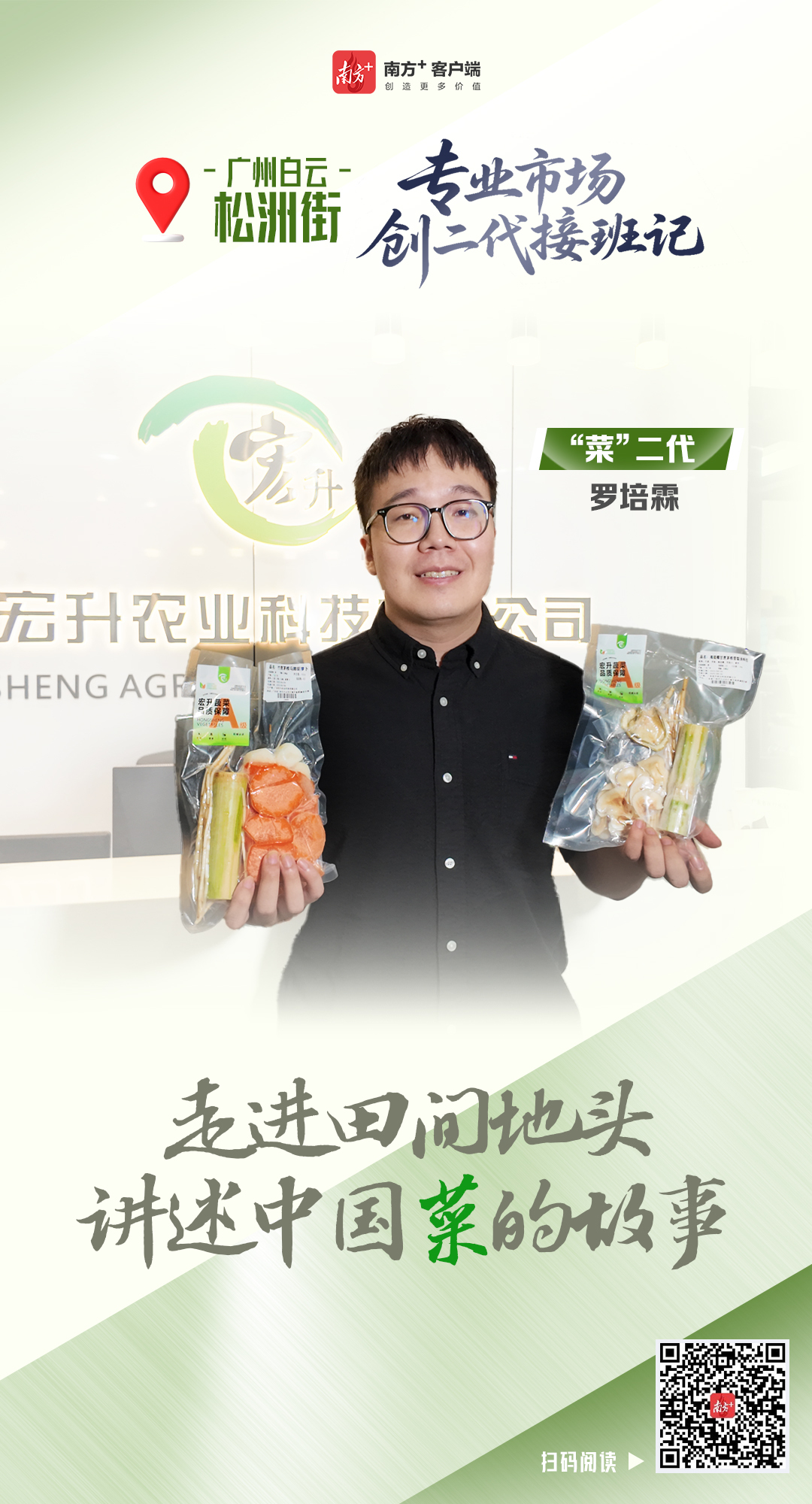 “没有故事就没有品牌,从来没有人想过去讲好中国蔬菜的故事。”2022年,他在英国拿到硕士学位,回国后在广告公司工作。他突然意识到,自己学的品牌方法论,可能正是父辈缺的那一环。于是,他拎着行李,回到父母卖菜的地方——白云区松洲街。
